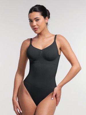 Seamless Bra Free Cami Tummy Control Thong Shapewear Bodysuit with Removable Pads