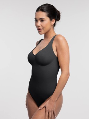 Seamless Diamond Neckline Bust Support Waist and Abdomen Control Thong Bodysuit